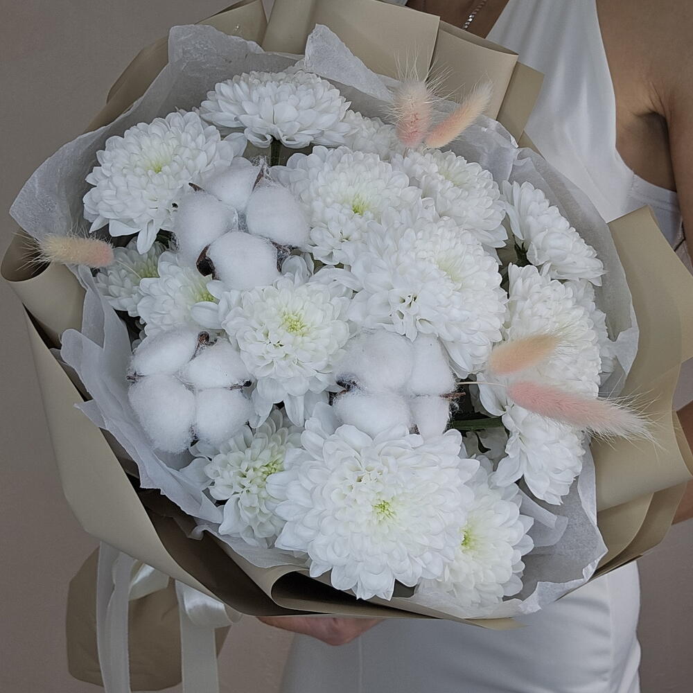 Хлопок - 3 шт. Хризантема кустовая - 3 шт. Лента атласная - 1 шт. Упаковка дизайнерская - 1 шт. Лагурус - 5 шт. Тишью белое - 2 шт. Пленка дизайнерская - 6 шт.