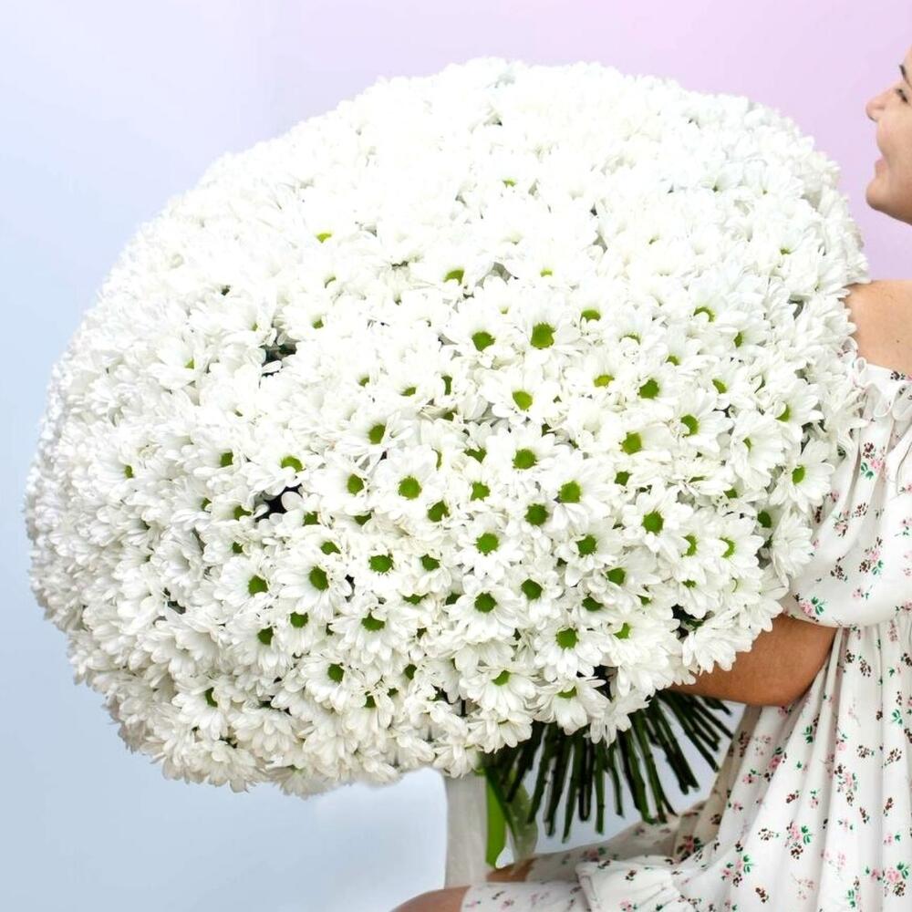 Роскошный огромный букет из 101 белой хризантемы для любимой девушки или жены. Отличный подарок на 8 марта